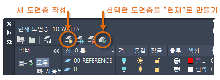새 도면층을 작성하려면 표시된 버튼을 클릭하고 새 도면층의 이름을 입력합니다. 다른 도면층을 현재 도면층으로 만들려면 도면층을 클릭한 다음 표시된 버튼을 클릭합니다.