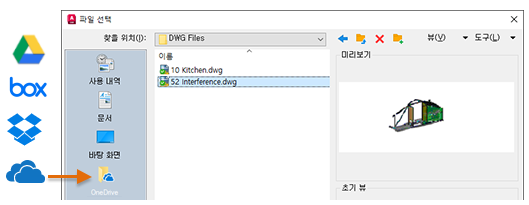 클라우드 저장소 공급자 계정이 있는 경우 AutoCAD 파일 선택 대화상자의 환경 막대에 추가하여 클라우드 저장소 계정의 도면을 직접 탐색할 수 있습니다. 환경 막대 내부를 마우스 오른쪽 버튼으로 클릭하고 탐색 바로 가기의 이름 및 경로를 입력하기만 하면 됩니다.