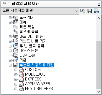 트리 뷰는 사용자 인터페이스 요소를 작성하고 관리하는 데 사용됩니다. 사용자 인터페이스 요소를 작성하고 나면 명령 리스트 창에서 명령을 끌어 해당 요소에 추가합니다. 트리 뷰에서 명령을 위로/아래로 끌어 리본 패널이나 도구막대와 같은 사용자 인터페이스 요소에서 명령이 나타나는 순서를 변경할 수도 있습니다.