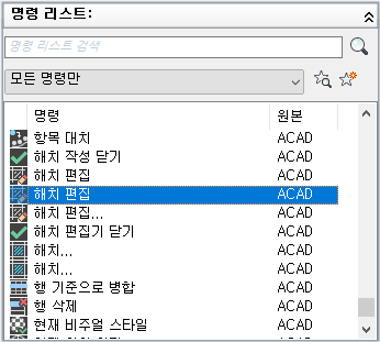 명령 리스트 창에는 현재 로드된 CUIx 파일에서 사용할 수 있는 모든 명령이 포함됩니다. 리스트에서 기존 명령을 선택하여 해당 특성을 수정하거나 새 명령을 작성할 수 있습니다. 새 명령을 작성하면 <파일 이름>의 사용자화 창의 맨 위 근처에 있는 드롭다운 리스트에 표시되는 CUIx 파일에 해당 명령이 추가됩니다.