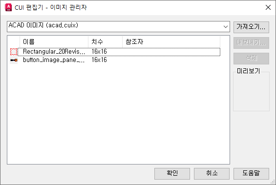 - 사용자화 탭에 있는 명령 리스트 창에서 아무 명령이나 선택하여 버튼 이미지 창을 표시합니다.