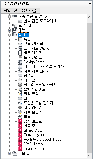 - 사용자화 탭에 있는 <파일 이름>의 사용자화 창에서 작업공간 노드 옆에 있는 더하기 기호(+)를 클릭하여 노드를 확장합니다.