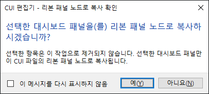 3. CUI 편집기 - 리본 패널 노드로 복사 확인 대화상자에서 예를 클릭합니다.