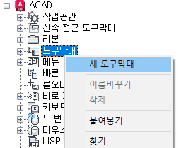 1. 사용자화 탭에 있는 <파일 이름>의 사용자화 창에서 도구막대 노드를 마우스 오른쪽 버튼으로 클릭하고 새 도구막대를 클릭합니다.