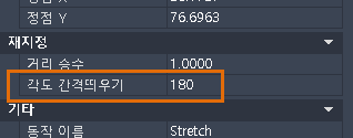 특성 팔레트에서 각도 간격띄우기를 180으로 설정합니다. 이렇게 하면 선형 그립을 끌 때 선택한 객체가 반대 방향으로 신축됩니다.