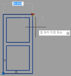 비어 있는 도면에서 36x72 직사각형을 그려 윈도우를 나타냅니다. 그림과 같이 내부 직사각형을 그립니다. 윈도우의 왼쪽 아래 구석을 0,0에 배치합니다. 이 위치는 블록의 기준 삽입점으로 사용됩니다.