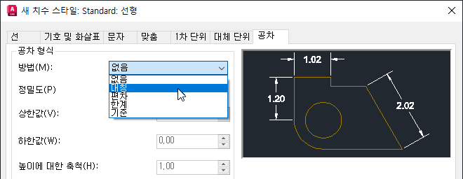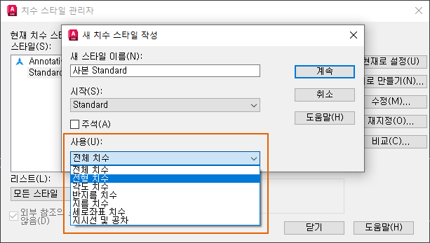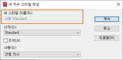 주: 특정 치수 유형을 선택하면, 시작 시 선택한 치수 스타일의 하위 스타일이므로 새 스타일 이름 문자 상자를 사용할 수 없습니다.