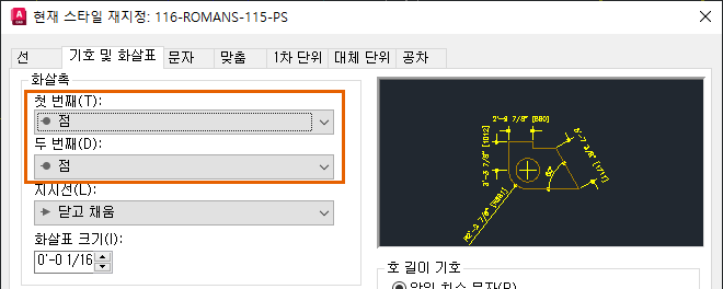 재지정된 설정이 이제 116-ROMANS-115-PS 치수 스타일의 기본 설정입니다.