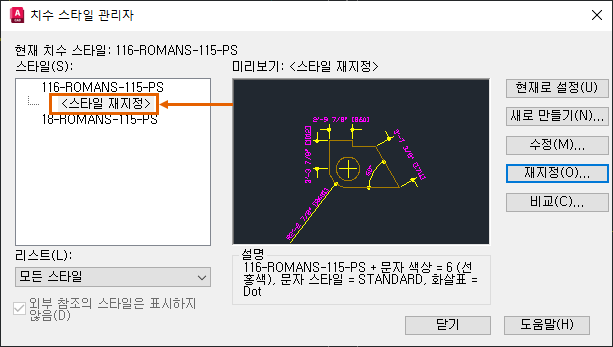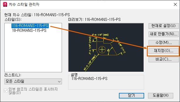 - 116-ROMANS-115-PS 치수 스타일 또는 그 아래에 있는 <스타일 재지정>을 선택합니다.