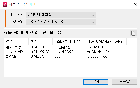 스타일과 해당 스타일 재지정 간의 차이점을 이해하려면 치수 스타일 관리자의 비교 기능을 사용합니다.