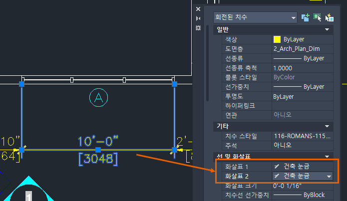 - 치수의 아무 특성이나 변경합니다. 예를 들어, 화살표 스타일을 건축 눈금으로 변경합니다.