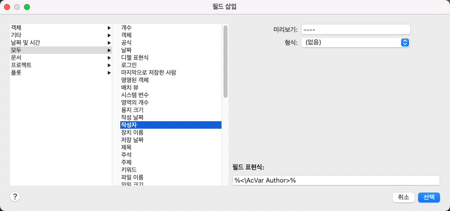 필드 삽입 대화상자