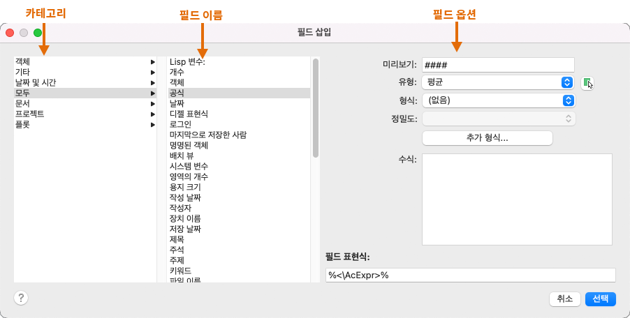 필드 삽입 대화상자에서 범주 및 필드 이름을 선택합니다.