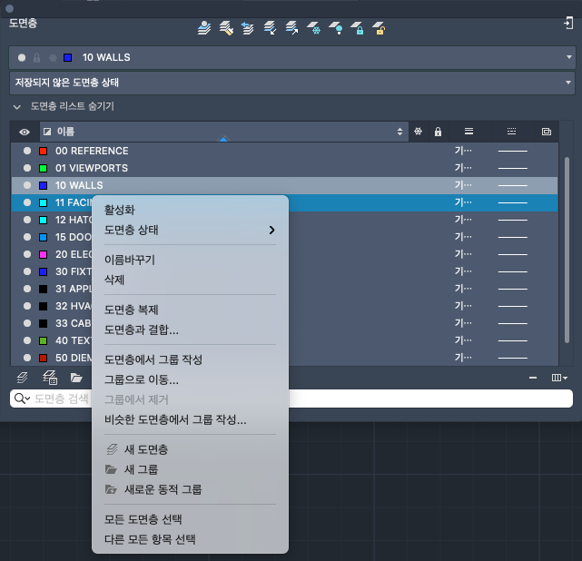 도면층 리스트를 사용하여 도면층 특성을 수정합니다. 현재 설정을 클릭하여 선택한 도면층 또는 도면층 그룹의 도면층 특성을 변경합니다. 또한 도면층을 두 번 클릭하면 현재 도면층으로 설정할 수 있습니다.