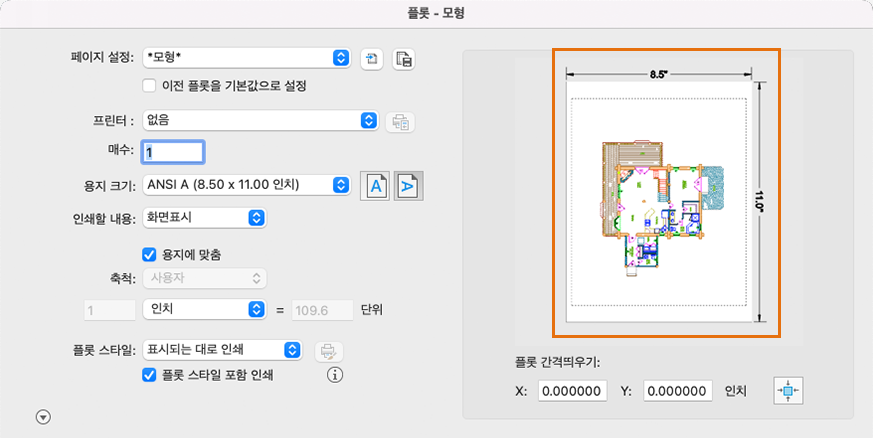 미리보기 영역을 통해 플롯할 때 도면이 나타나는 방식을 쉽게 확인할 수 있습니다.