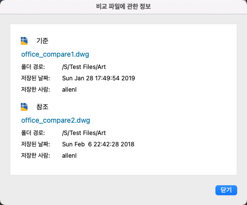 이 명령은 비교된 두 개의 도면 파일에 대한 정보를 표시하는 대화상자를 엽니다.