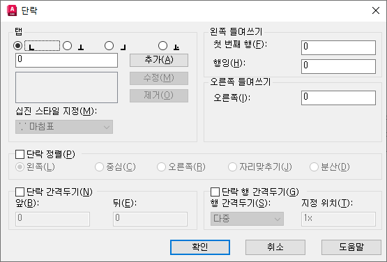 첫 번째 행의 들여쓰기 값 또는 선택한 단락이나 현재 단락의 들여쓰기를 설정합니다.