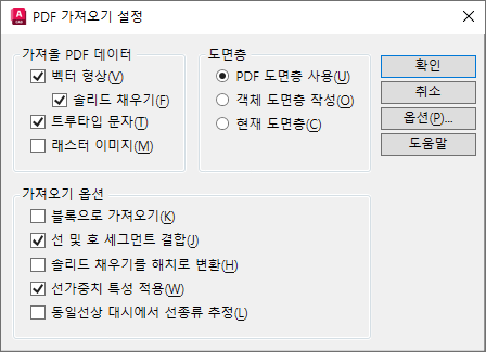 지정한 PDF 파일에서 형상, 채우기, 래스터 이미지 및 트루타입 문자 객체를 가져오기 위한 옵션을 설정합니다.