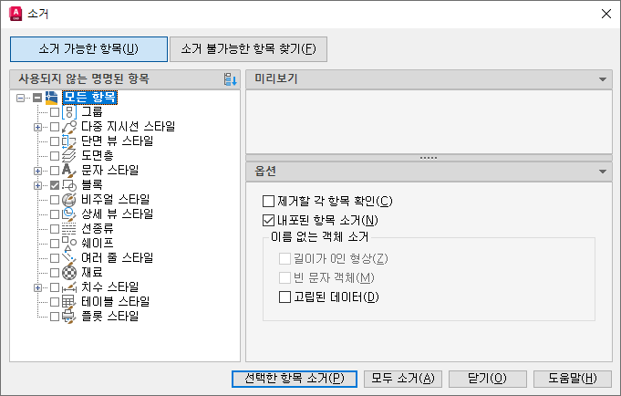 도면에서 사용되지 않는 모든 명명된 객체가 사용되지 않는 다른 명명된 객체에 포함되어 있거나 참조되는 경우에도 이들 객체를 제거합니다.
