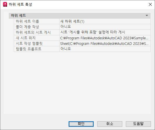 하위 세트에 대한 새 도면 파일을 작성하기 위해 사용되는 도면 템플릿(DWT) 파일 및 배치 이름을 지정합니다.