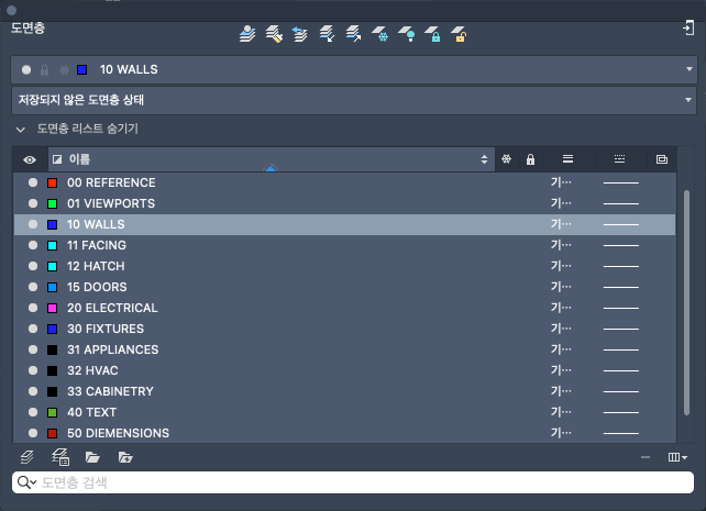 도면층 리스트를 사용하여 도면층 특성을 수정합니다. 현재 설정을 클릭하여 선택한 도면층 또는 도면층 그룹의 도면층 특성을 변경합니다. 또한 도면층을 두 번 클릭하면 현재 도면층으로 설정할 수 있습니다.