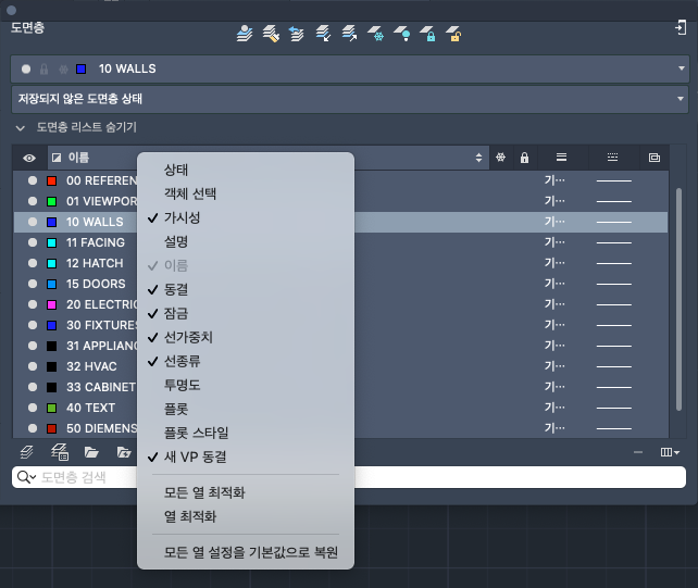 - 도면층 리스트에서 열 제목 표시를 전환하고, 전체 열 또는 선택한 열의 크기를 최대 폭으로 자동으로 조정하는 옵션을 제공합니다.