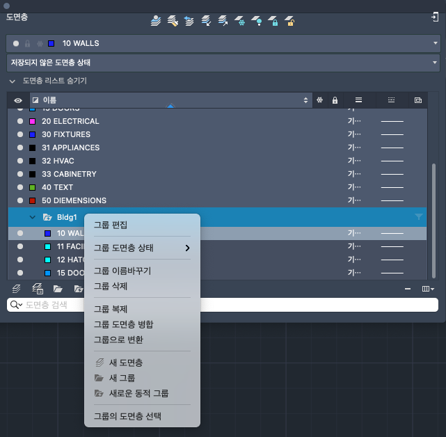 - 선택한 도면층 그룹을 숨깁니다. 자동 그룹 표시 메뉴에서 선택해 그룹을 표시할 수 있습니다.