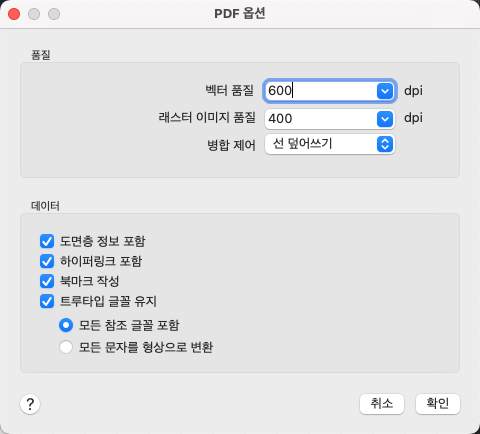 - PDF 파일에 트루타입 글꼴이 포함되므로 PDF 뷰어에서 해당 글꼴을 사용할 필요가 없습니다. 이 옵션을 선택하지 않을 경우, PDF 뷰어에서 대체 글꼴을 사용합니다.