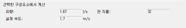 급수관 크기 조정 대화상자의 선택한 구성요소에서 계산 섹션에는 계산된 선택한 구성요소 값이 편집 불가능 상태로 표시됩니다.