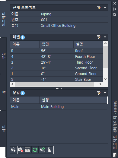 프로젝트 네비게이터를 통해 중앙의 한 위치에서 건물 레벨과 부속건물(윙) 정의, 프로젝트 도면 작성 및 플로팅 시트 작성과 같은 프로젝트별 작업을 수행할 수 있습니다.