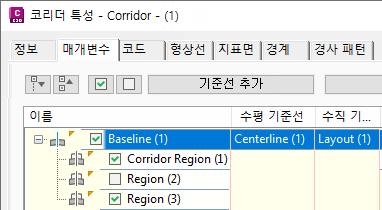 긴 코리더나 코리더 네트워크의 경우 모델링을 위해 여러 영역을 작성합니다. 일반적으로 코리더 영역은 한 표준횡단 사용이 끝나고 다른 표준횡단이 시작되는 위치에서 영역 경계가 발생할 때 서로 다른 표준횡단 사용을 표시하기 위해 사용됩니다. 그러나 표준횡단을 변경하지 않고 영역을 추가할 수도 있습니다. 추가 영역의 값은 제어가 가능합니다. 그림 13에서처럼 코리더 특성 대화상자를 사용하여 현재 작업에 필요하지 않은 영역의 모델링을 끌 수 있습니다. 이렇게 하면 코리더 재작성 속도가 향상됩니다.