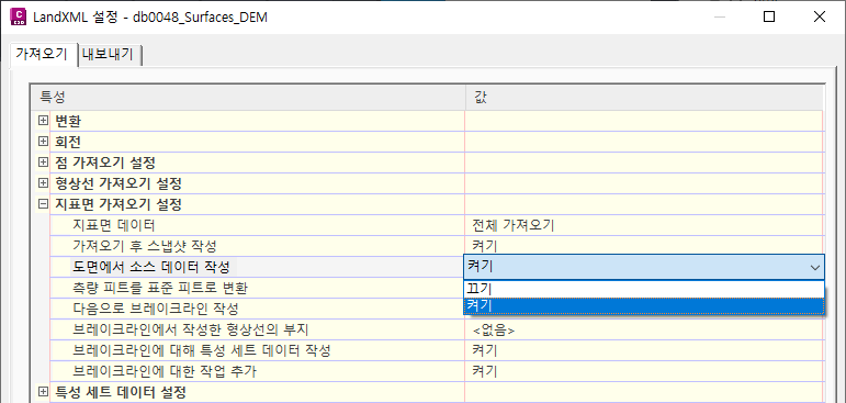 지표면을 작성하기 위해 LandXML 데이터를 가져오기 전에 그림 2에서와 같이 지표면 가져오기의 LandXML 설정을 확인합니다.