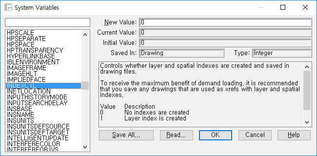 작업 그룹이 큰 경우 각 컴퓨터에서 실행할 스크립트를 작성하여 AutoCAD 설정을 표준화할 수 있습니다. 이를 위해서는 컴퓨터에서 변수를 구성한 다음 시스템 변수 대화상자에서 모두 저장을 클릭합니다. 각각 다른 컴퓨터에서 실행하여 설정을 업데이트할 수 있는 SVF 파일 또는 SCR 파일에 설정이 저장됩니다. 자세한 내용은 시스템 변수 대화상자의 도움말을 참고하십시오.