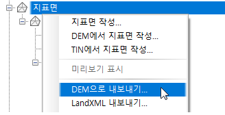 Autodesk Civil 3D에서는 지표면에서 DEM 파일을 내보낼 수 있습니다. 내보내기 시 그리드 간격을 확장하여 이 파일을 더 작게 만들 수 있습니다. 그림 3에서는 내보내기 프로세스를 시작하는 데 사용되는 메뉴 선택을 보여 줍니다.