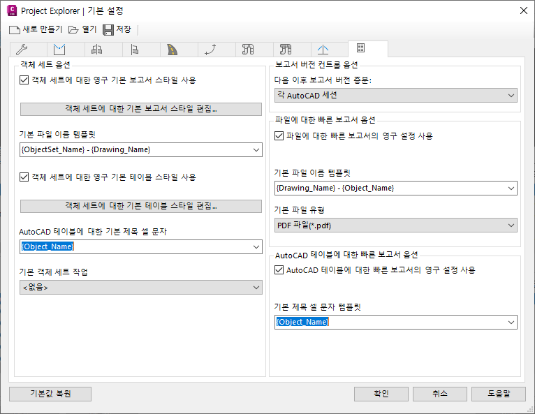 보고서 및 테이블 기본 설정 탭
