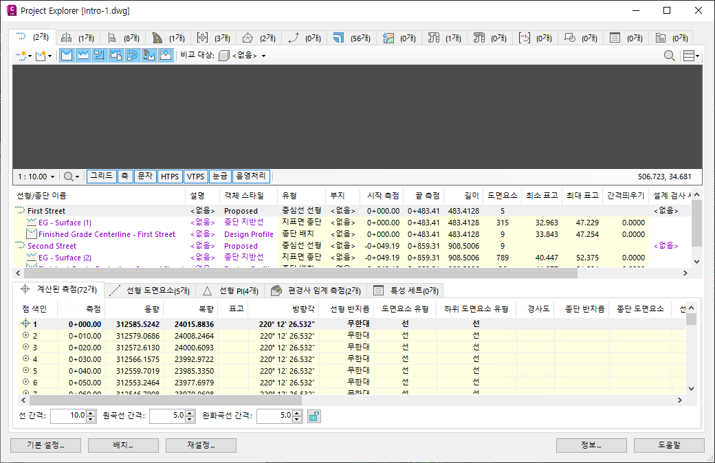 선 도면요소, 원곡선 도면요소 및 완화곡선 도면요소의 선형/종단 측점(측점) 간격을 수정합니다.