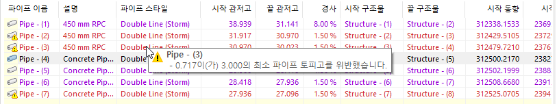 - Civil 모형 내에서 비정상적인 상태로 간주되는 객체