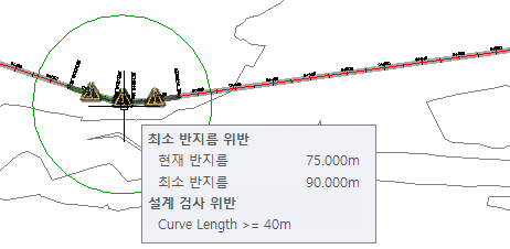 길이 값이 설계 검사에 지정된 값 40보다 작습니다. 이 원곡선 유형의 길이 값은 편집할 수 없습니다. 하지만 원곡선 반지름을 늘려 원곡선 길이를 늘릴 수 있습니다.