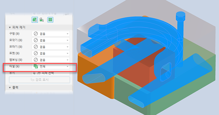 - 최소 상세 정보 제거(작은 부품 및 피쳐) - 이 설정은 작은 부품 및 피쳐를 제거하여 가장 상세한 모형을 생성하도록 고안되었습니다.