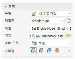 - 기본적으로 내부 부품 제거가 선택되어 있습니다. Inventor에서는 14개 표준 방향(직교 방향 6개와 등각투영 방향 8개)에서 모형을 확인하여 부품 가시성 상태를 결정합니다. 비가시적인 것으로 간주되는 부품은 제거됩니다.