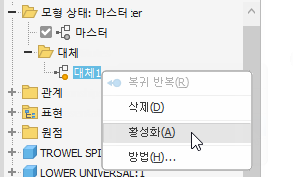 대체 구성요소가 되도록 부품 또는 조립품을 작성할 때마다 해당 구성요소의 상황에 맞는 메뉴에 대체라는 읽기 전용 상태가 표시됩니다. 대체를 선택하면 부품 또는 조립품이 대체 모형이 됩니다. 따라서 모든 부품 파일에는 대체 상태가 있습니다. 구성요소가 대체 구성요소로 작성된 경우에만 선택됩니다.