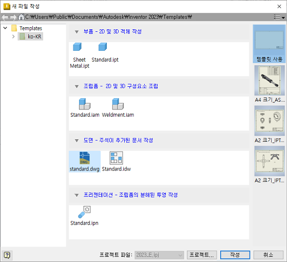 - 새 도면 파일을 작성하는 동안 템플릿 내에서 시트 형식을 사용할 수 있습니다.