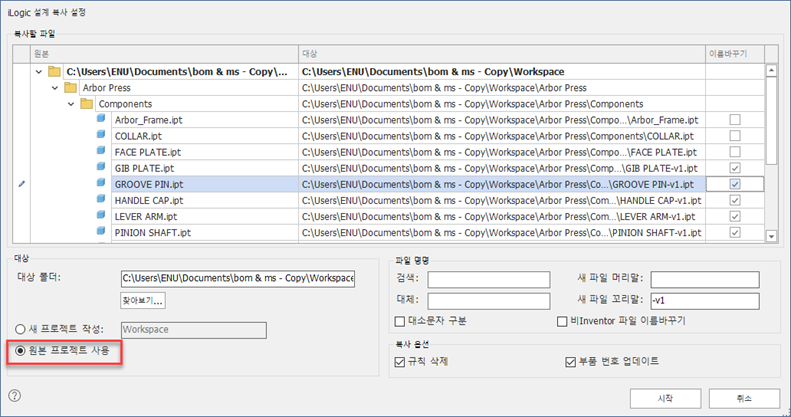 이제 파일을 복사하고 새 프로젝트 파일을 작성하지 않고도 파일을 재사용할 수 있습니다. 대상 폴더가 원본 폴더와 같은 경우 iLogic 설계 설정 복사 대화상자에서 "원본 프로젝트 사용" 옵션을 선택하고 원하는 머리말이나 꼬리말을 지정하거나 검색 및 대체 옵션을 선택하여 파일의 이름을 바꿉니다. 그런 다음 이름을 바꾸지 않을 특정 파일에 대한 이름바꾸기 옵션의 선택을 취소합니다.