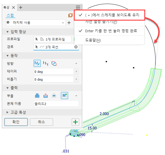 스윕 명령을 사용할 때 적용을 사용하여 스윕 세그먼트를 작성할 때 경로 스케치를 계속 표시하는 옵션이 있습니다. 스윕 특성 패널의 고급 설정 메뉴에서 ( + )에서 스케치를 보이도록 유지 옵션을 선택합니다.