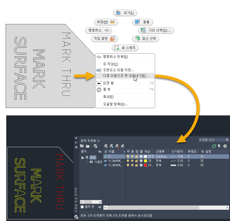 다른 이름으로 면 내보내기 명령을 사용하여 표식 피쳐가 있는 면을 DXF로 내보내는 경우, 표식 스타일 도면층 설정은 DXF 파일에 유지됩니다.