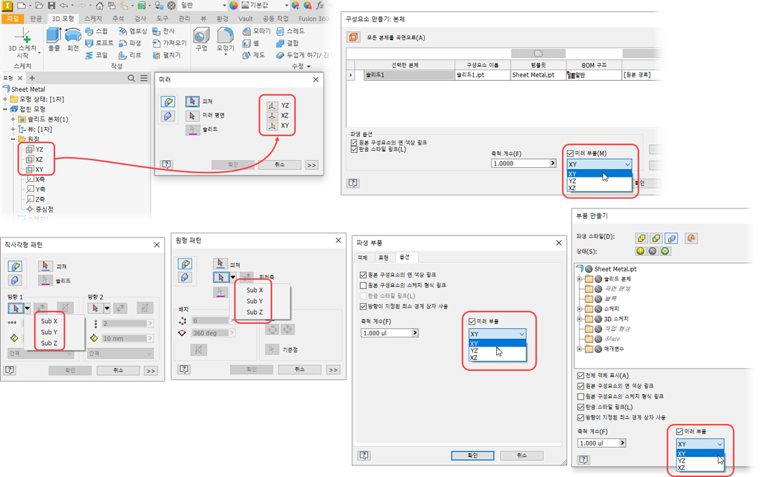이제 원점 작업 피쳐에 지정된 사용자 이름이 인식되어 미러, 구성요소 만들기, 부품 만들기, 직사각형 및 원형 패턴, 파생 부품 등의 다양한 대화상자가 채워집니다.