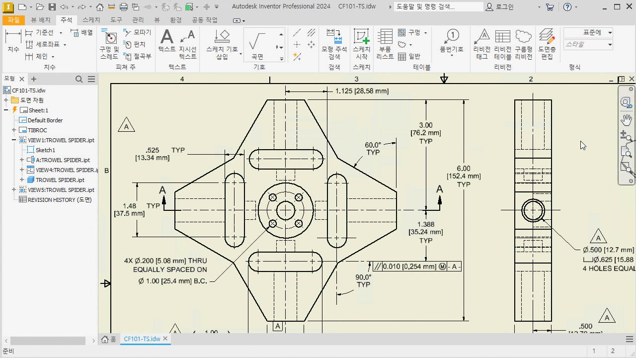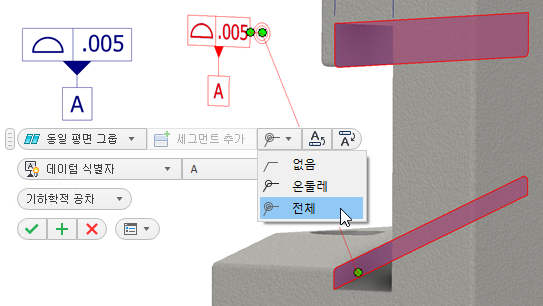 이제 구멍 주 및 치수에 덮개 요구사항 수정자를 사용할 수 있습니다. 주석 미리보기에서 치수를 클릭하고 도구막대에서 덮개 수정자를 선택합니다.