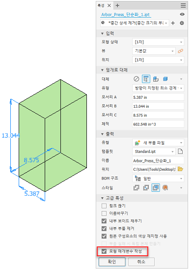 새 "모형 매개변수 작성" 옵션이 특성 패널의 고급 특성에 추가되었습니다. 이 옵션을 선택하면 단순화된 파일에 "모서리 A", "모서리 B" 및 "모서리 C"에 대한 읽기 전용 매개변수 3개가 작성됩니다.