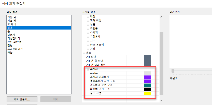 이 릴리즈에서는 도면 스케치 요소에 대해 색상 체계 설정을 지정할 수 있습니다. 지금까지는 요소 색상이 시트 색상 설정과 충돌하는 경우 요소 작업을 하기가 어려웠습니다. 제도 제목 아래의 새 스케치 옵션을 사용하면 도면 환경에 대해 스케치 요소의 색상을 설정할 수 있습니다.