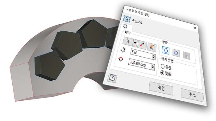 이제 회전된 면, 원통형 또는 원추형을 선택하여 구성요소 패턴의 방향을 정의할 수 있습니다. 패턴 구성요소 명령은 면 축을 사용하여 패턴 방향을 정의합니다. 표준 컨트롤을 사용하여 방향을 반전합니다.
